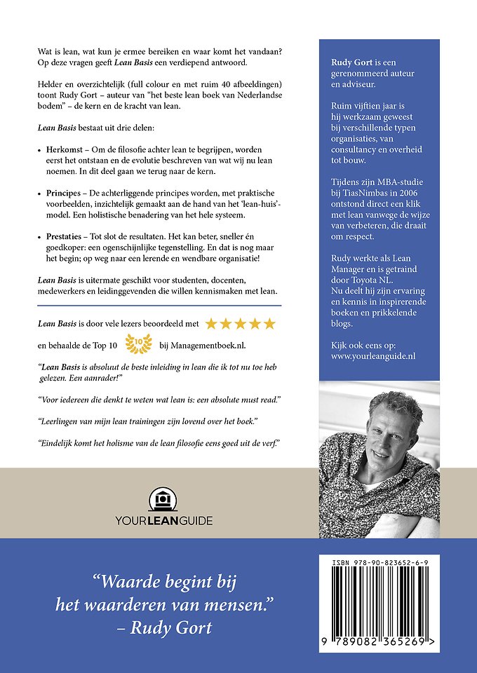 Meer over Rudy GortWat is lean, wat kun je ermee bereiken en waar komt het vandaan? Op deze vragen geeft Lean Basis een verdiepend antwoord. Helder en overzichtelijk (full colour en met ruim 40 afbeeldingen) toont Rudy Gort – auteur van het beste lean boek van Nederlandse bodem – de kern en de kracht van lean. 'Lean Basis' bestaat uit drie delen: • Herkomst – Om de filosofie achter lean te begrijpen, worden eerst het ontstaan en de evolutie beschreven van wat wij nu lean noemen. In dit deel gaan we terug naar de kern. • Principes – De achterliggende principes worden, met praktische voorbeelden, inzichtelijk gemaakt aan de hand van het 'lean-huis'- model. Een holistische benadering van het hele systeem. • Prestaties – Tot slot de resultaten. Het kan beter, sneller én goedkoper: een ogenschijnlijke tegenstelling. En dat is nog maar het begin; op weg naar een lerende en wendbare organisatie! 'Lean Basis' is uitermate geschikt voor studenten, docenten, medewerkers en leidinggevenden die willen kennismaken met lean. 'Lean Basis' is door vele lezers beoordeeld met ***** en behaalde de Top 10 bij Managementboek.nl. 'Lean Basis' is absoluut de beste inleiding in lean die ik tot nu toe heb gelezen. Een aanrader! Voor iedereen die denkt te weten wat lean is: een absolute must read. Leerlingen van mijn lean trainingen zijn lovend over het boek. Eindelijk komt het holisme van de lean filosofie eens goed uit de verf.